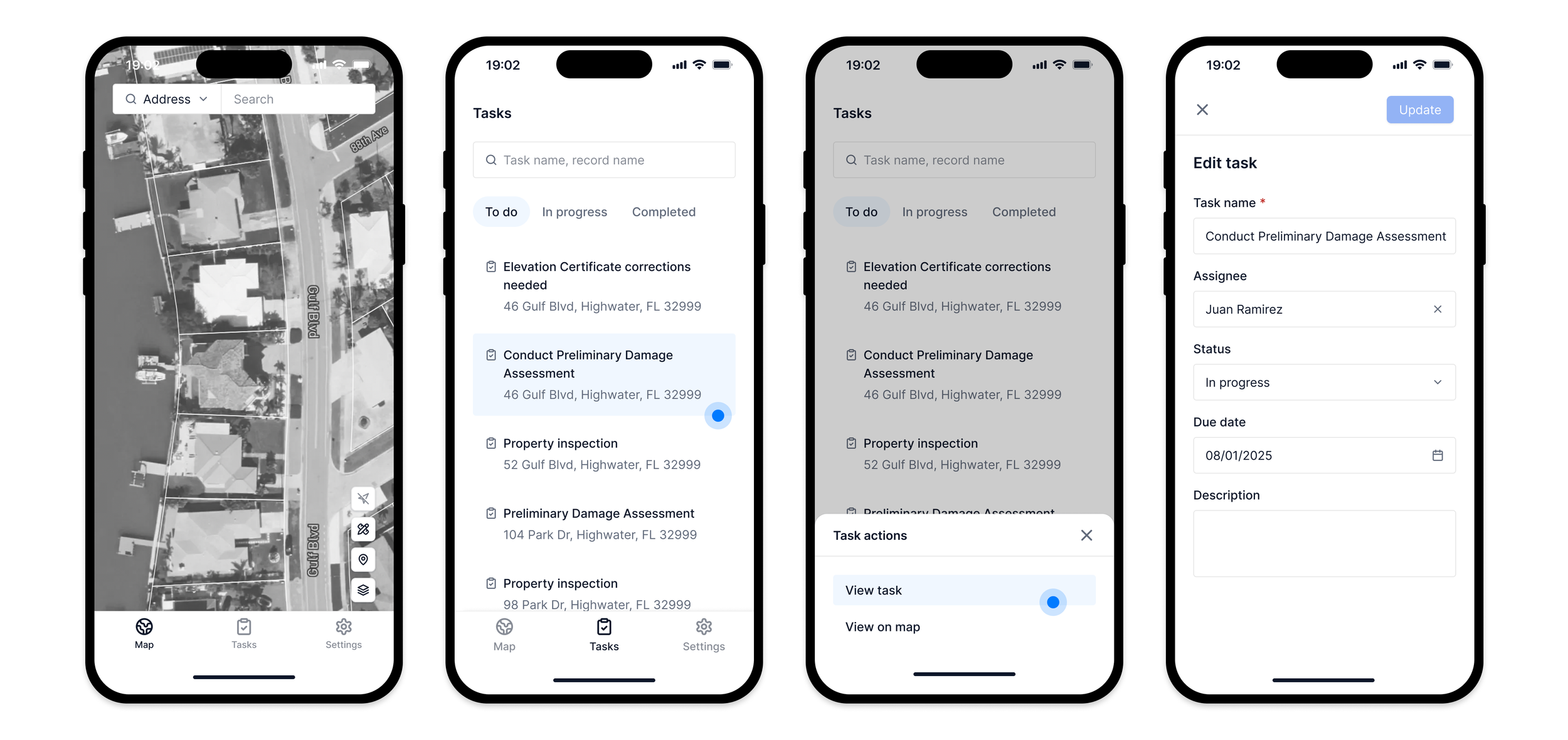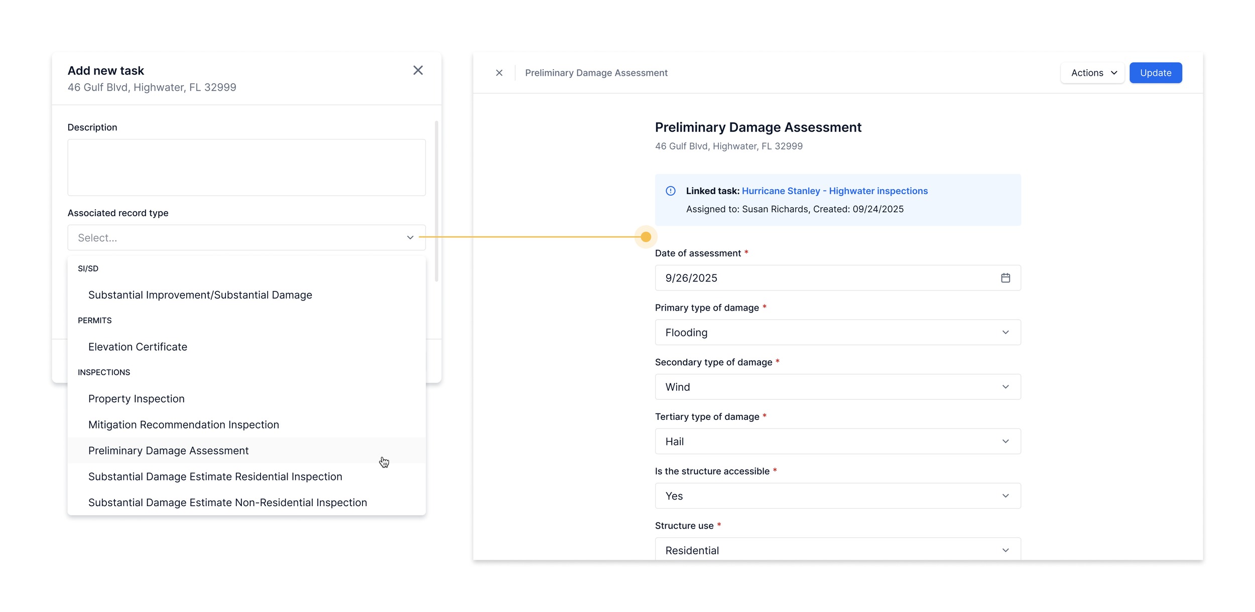 Record linking: Customers wanted a way to associate a task with a record (such as an inspection form or damage assessment) for traceability, and to see that connection reflected in both directions.