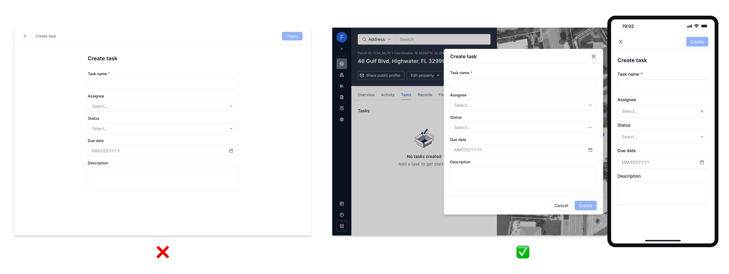 To create a Task , I explored using our existing pattern for full-page forms, but decided on a modal instead to keep users anchored in context. Creating or editing a task is typically a quick, lightweight action, and using a modal reduces cognitive load, allowing users to stay within the property or record they were already viewing.