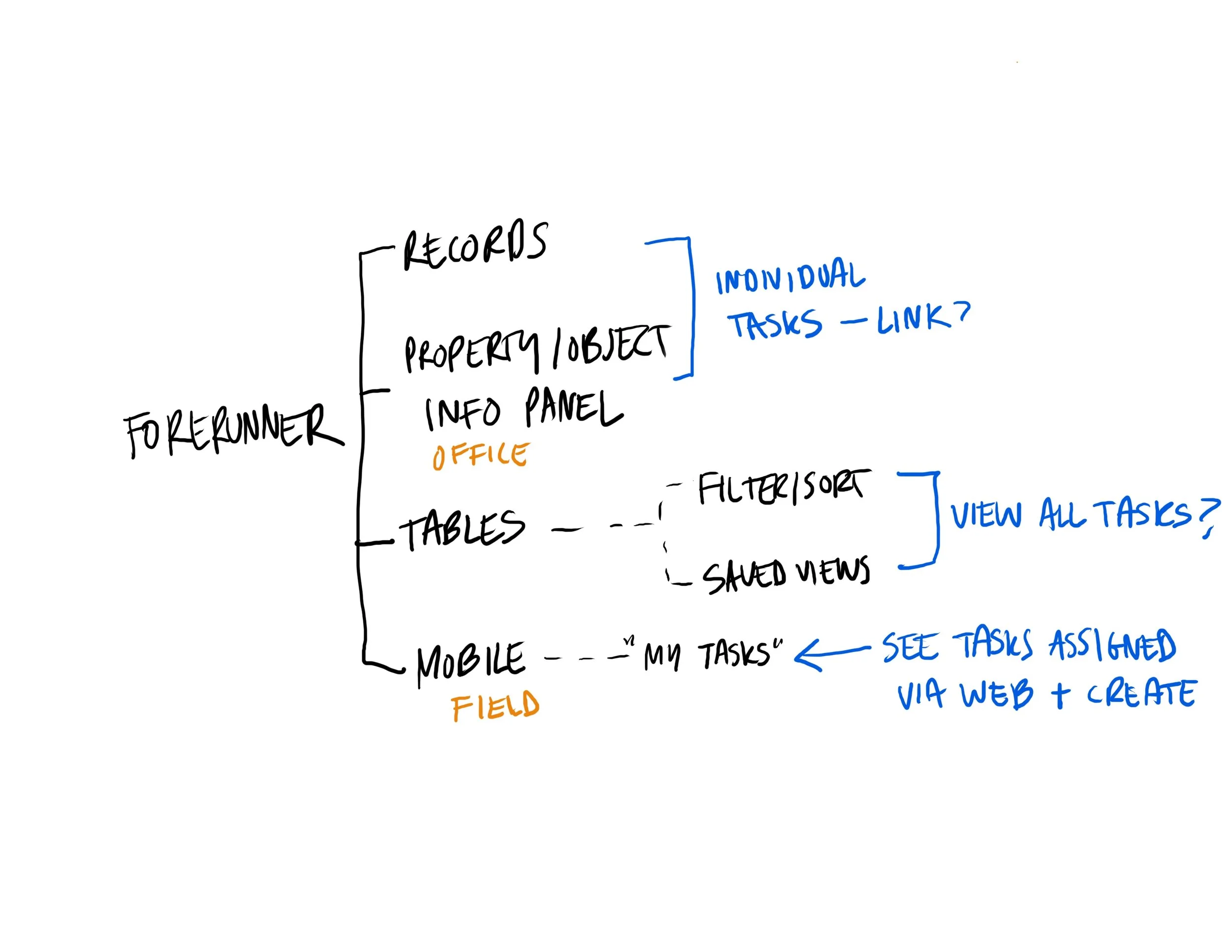 To kick off ideation, I thought through where Tasks might live within Forerunner and how users would naturally encounter them across the product. The main candidates were the Property/Object Information Panel, Records, Tables, and Mobile.
