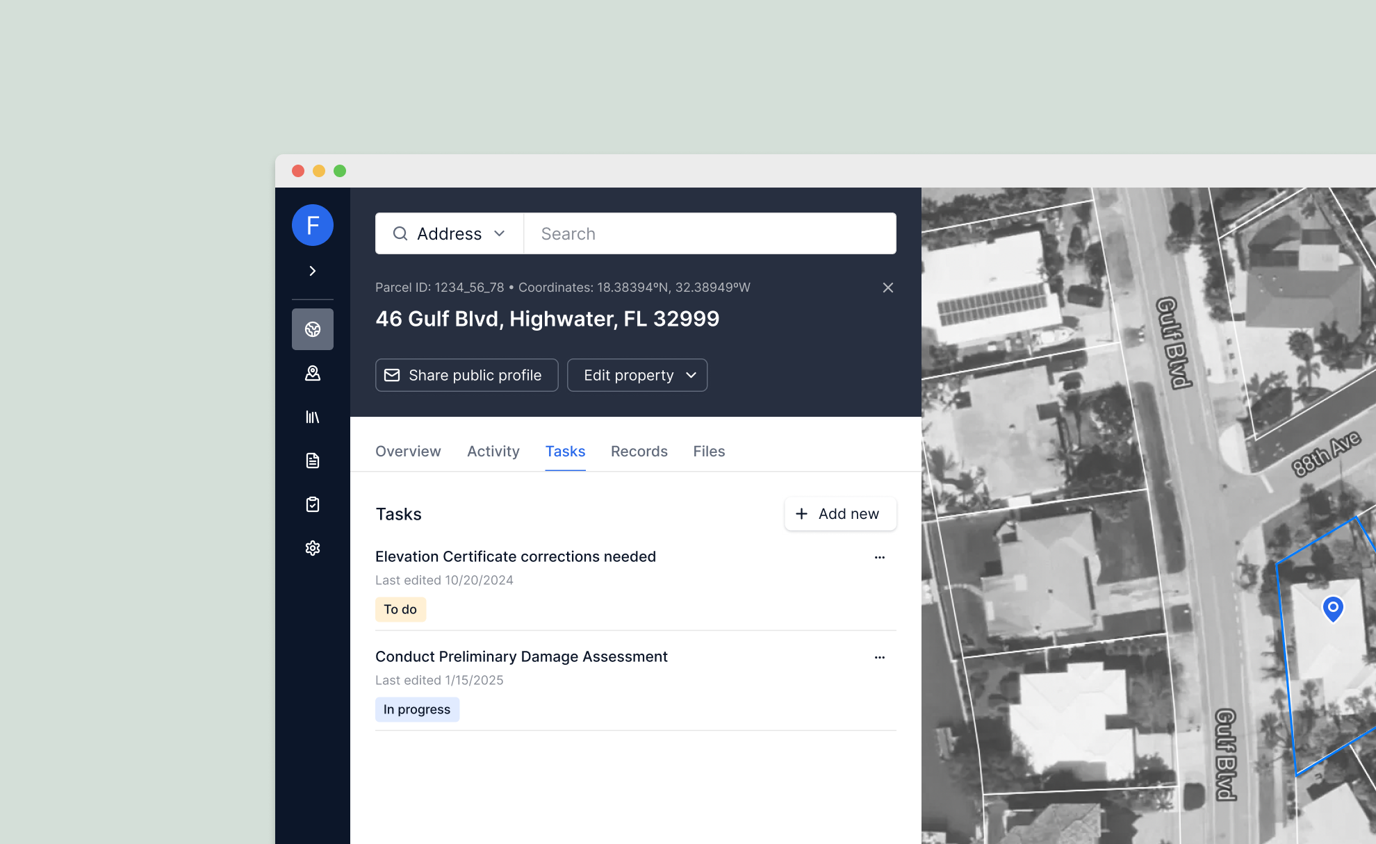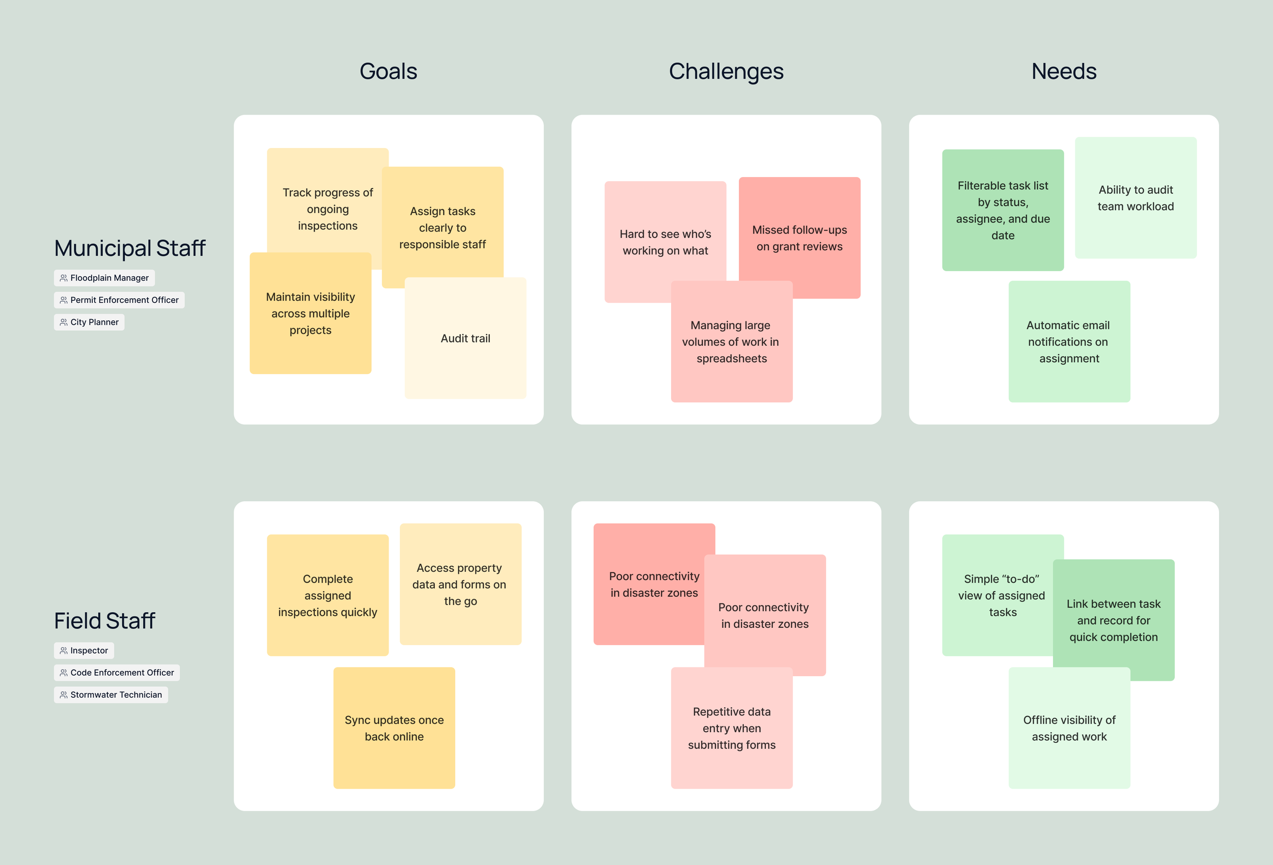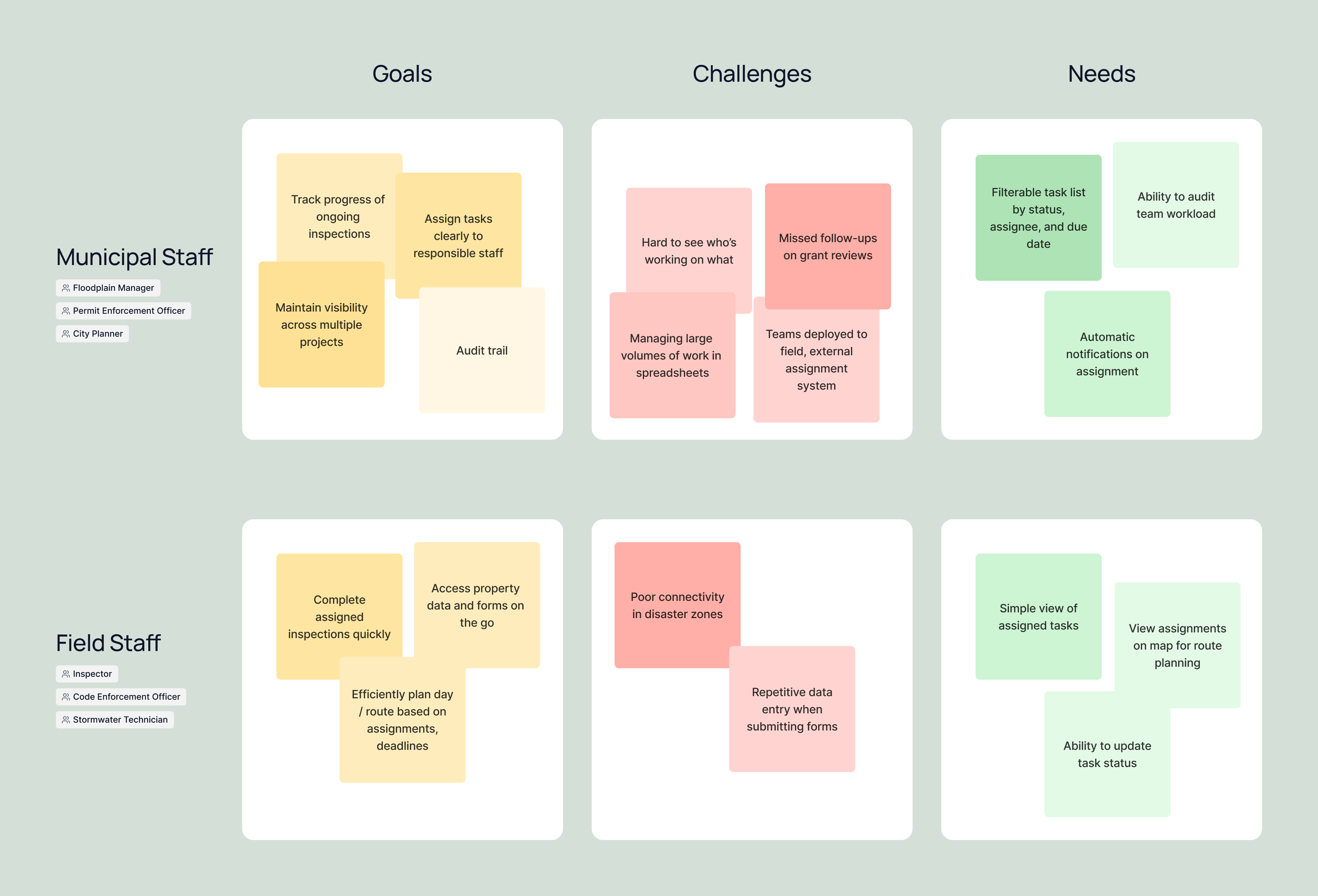 Municipal staff working in floodplain management, inspections, code enforcement, and disaster recovery needed a way to track their operational work more efficiently through Forerunner. Before this feature, there was no native way to assign or monitor discrete tasks, leading to a patchwork of external spreadsheets, sticky notes, and emails.