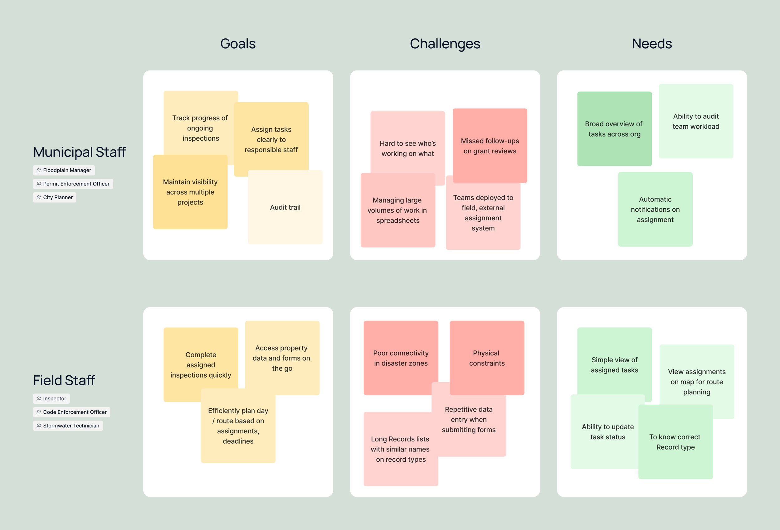 At this stage, the idea was straightforward: a basic task assignment tool. To ground our assumptions, I mapped out the main user roles and documented their goals, pain points, and success criteria.