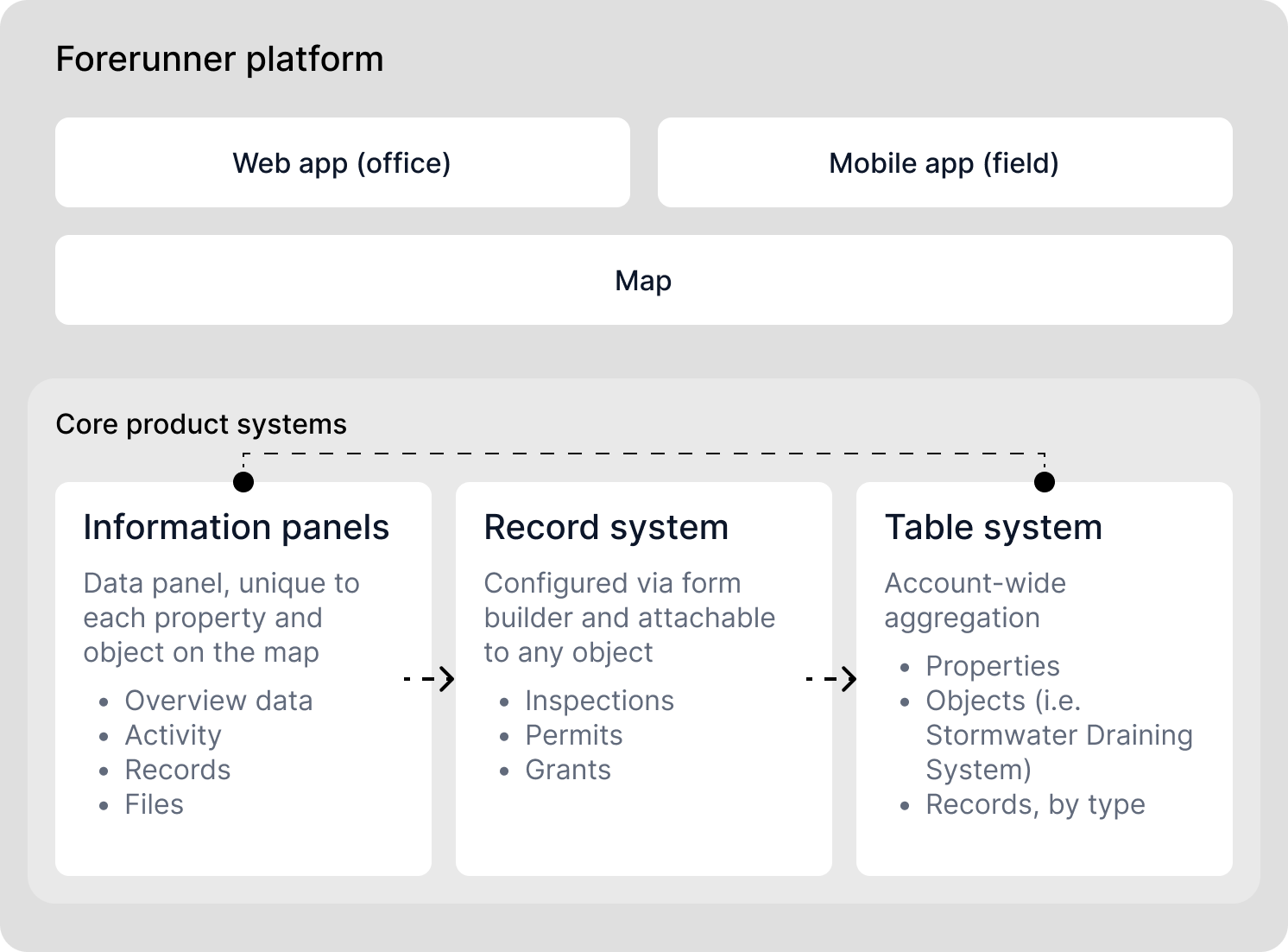 To kick off ideation, I thought through where Tasks might live within Forerunner and how users would naturally encounter them across the product. The main candidates were the Property/Object Information Panel, Records, Tables, and Mobile.