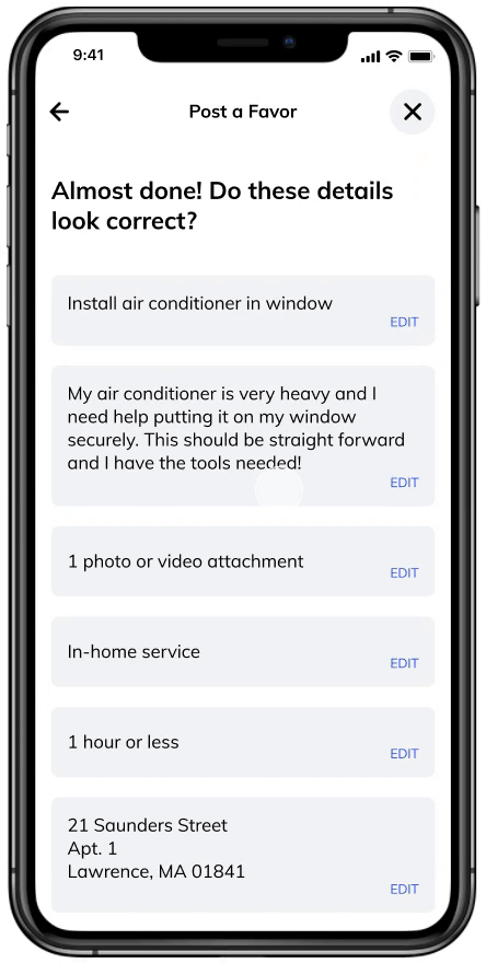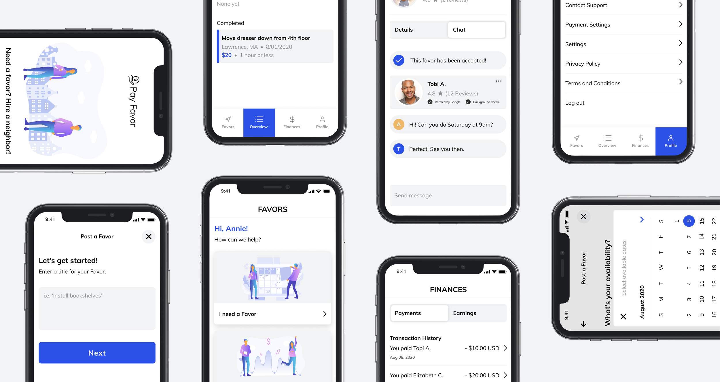 This prototype runs through onboarding, initial account set up, and the user flow for posting and marking a Favor as completed. Not included in this prototype is the process for linking your bank or credit card information, what a delivery request might look like, and the user flow for browsing open Favor requests and accepting these. Try the prototype below (it’s expandable) or click here to open it separately.