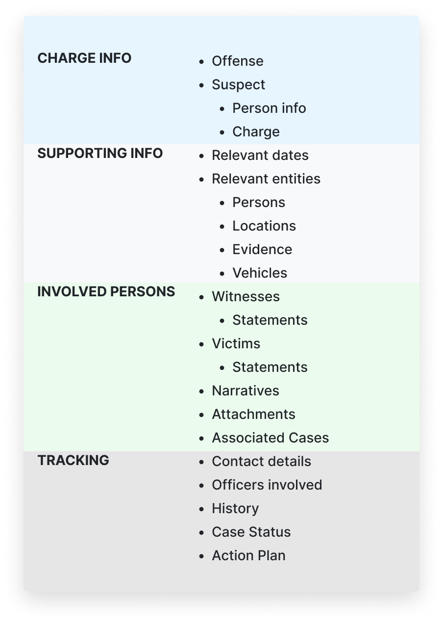 There were two major product concepts to figure out for this project – UX/UI for DCF and the data model for the integration between Mark43 and the courts. To begin, I came up with high level categories for design needs that would allow users to: