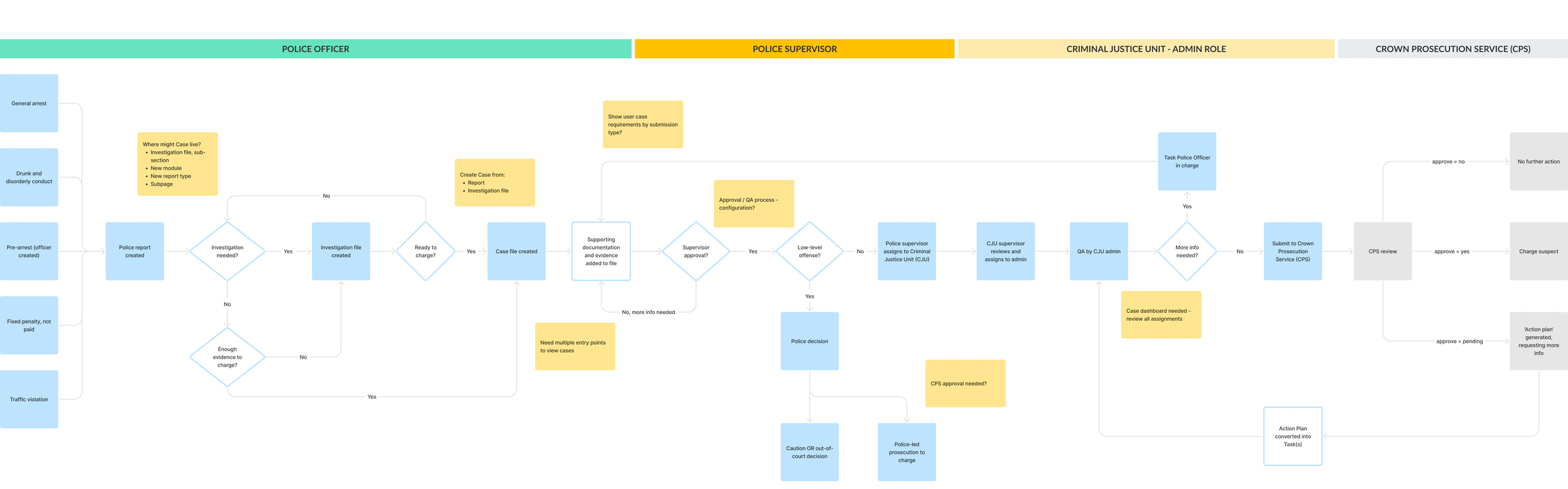 We measured the success of this project through the aligned vision of the prototype to the larger user flow, and through meeting the requirements set forth by the UK government for case filing with local courts. 8+ participants were enlisted in research, discovery and design validation, across multiple police departments in Northern England – all of which were positive about our proposed solution.