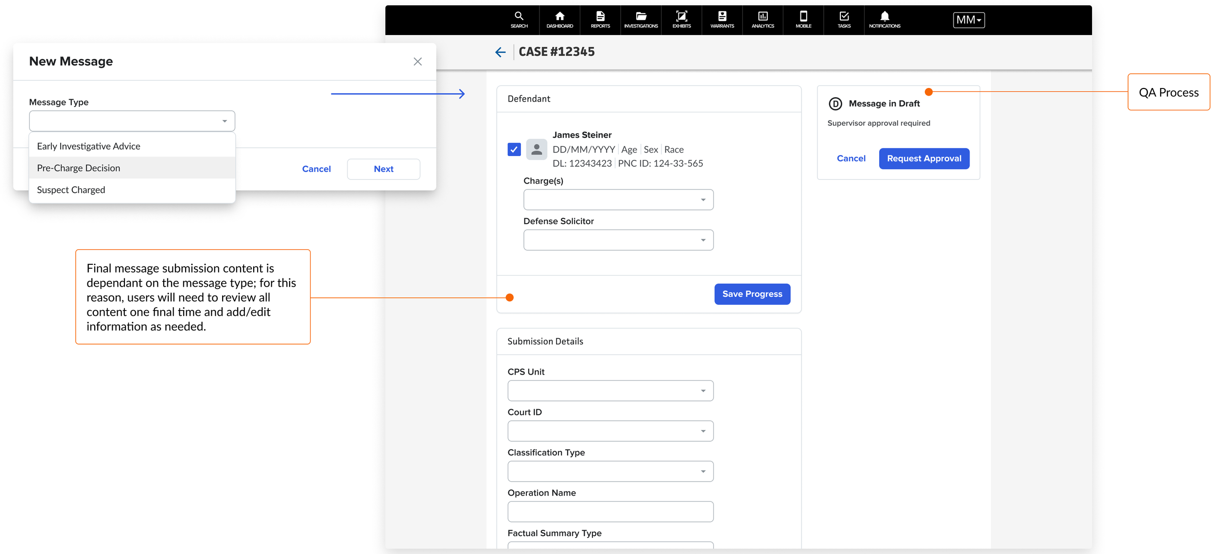 The QA process is not linear for every case but dependent on factors such as whether suspect has already been arrested, bail timelines, availability of supervisors, etc.; the system doesn’t currently account for these scenarios