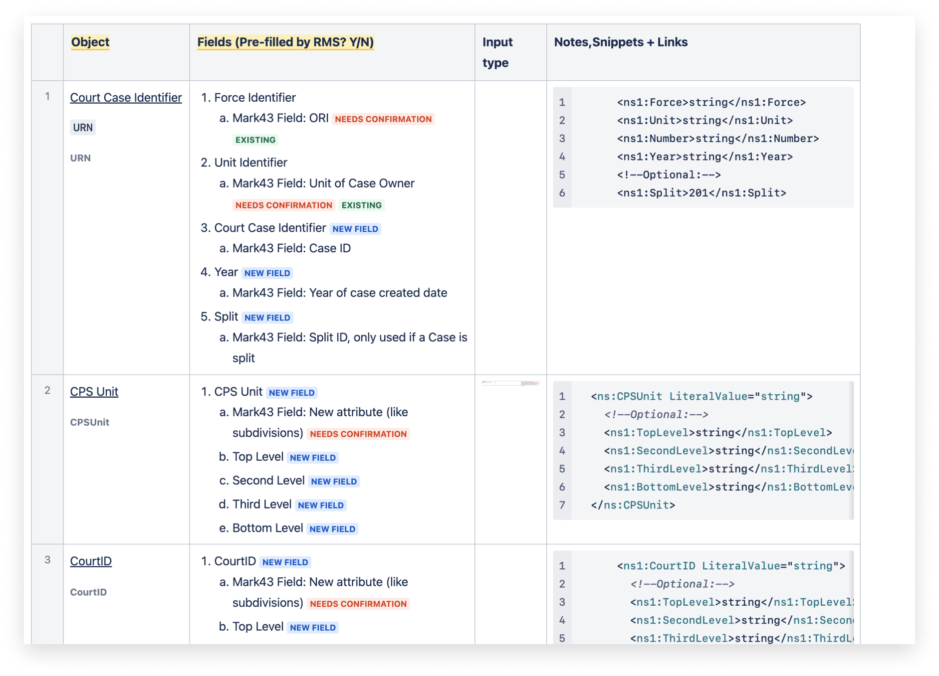 I also partnered with engineering and our Technical Product Manager to break down the case filing integration’s data model – understanding interface implications of objects and fields, and thinking through the optimal information hierarchy for these. This was necessary in order to give this data some structure and to unblock engineering from getting started on the integration before final designs.